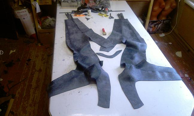 Чо-то эти два гоблина народ тут заинтриговали, Эльвиру запугали. Теперь уже реально и не знаю, что из этого всего получится и получится ли вообще хоть что-то. А шьется всё нитками, впрочем, клеится тоже, потому что пытаемся шить мокрые гидрокостюмы из неопрена с фактурным покрытием.