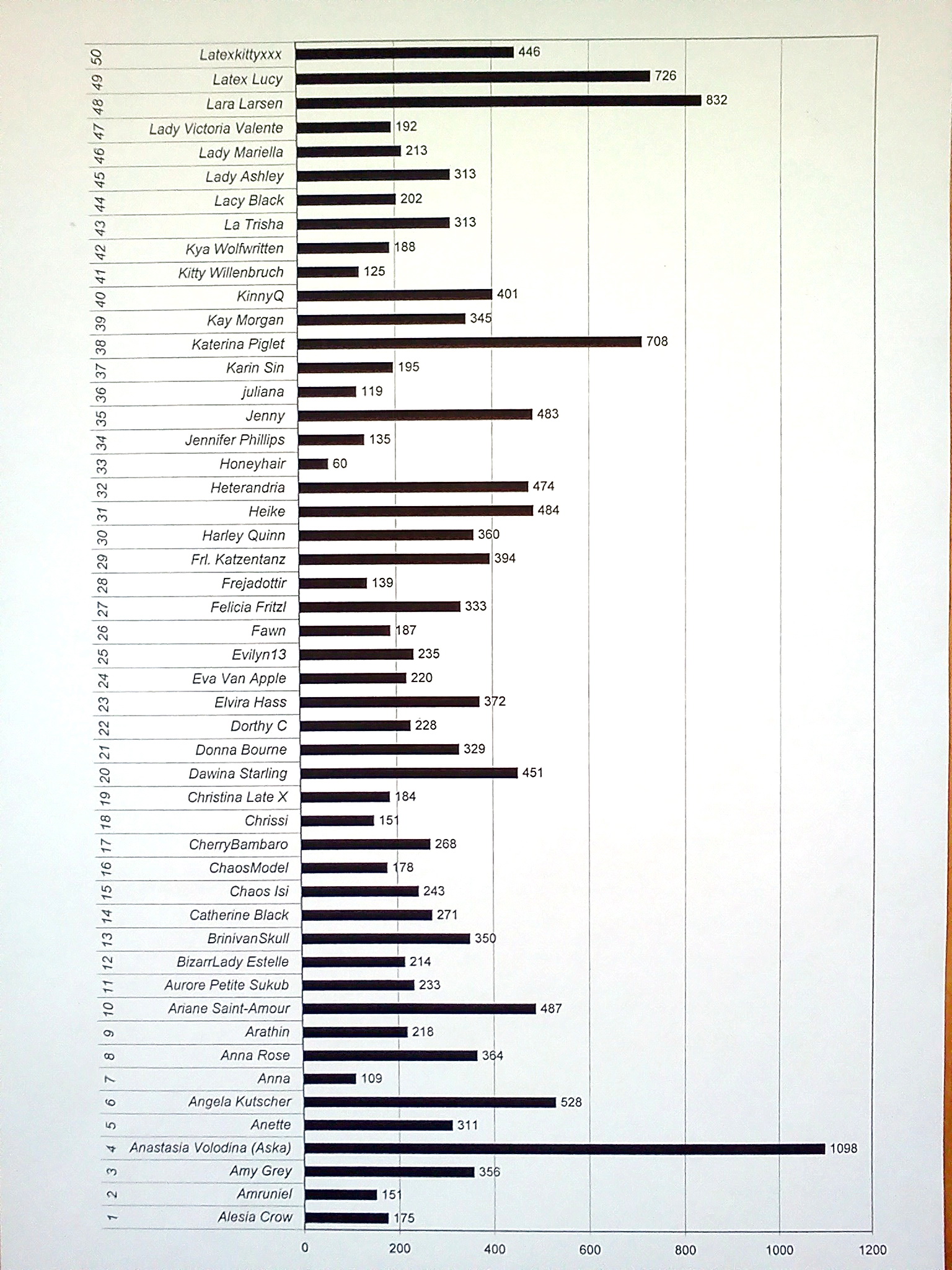 Мы по-прежнему в лидерах! Безусловный лидер - Аска, а Катерина постепенно догоняет Латекс Льюси. Очень уверенно идут Лара Ларсен, Мисс Рубекс и Лора Парадайз. Все остальные участники образуют некое "стадо" в котором разница в очках сравнима со статистической погрешностью.