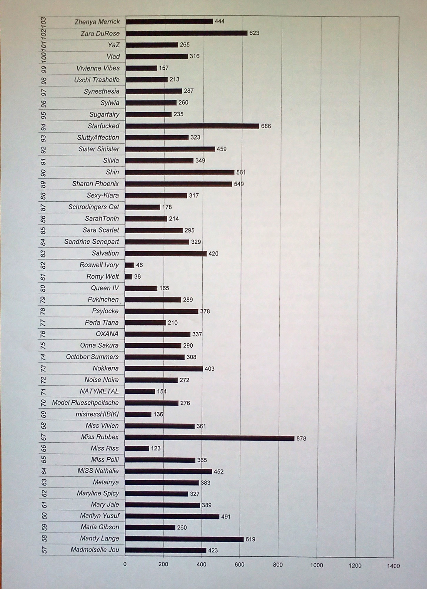 Месячный марафон выявил явных лидеров, "стадо" и явных аутсайдеров. Как показывает статистика - одевай-не одевай маску, меняй-не меняй фоты в портфолио, аутсайдер остается аутсайдером. "Стадо" - возможно, и не совсем отсталые модели и чой-то оне могут, но просто затерялись в ширенгах разных "мадам", "леди" и прочих "кити-кэтов". В лидерах (и аутсайдерах) модели под собственными именами.