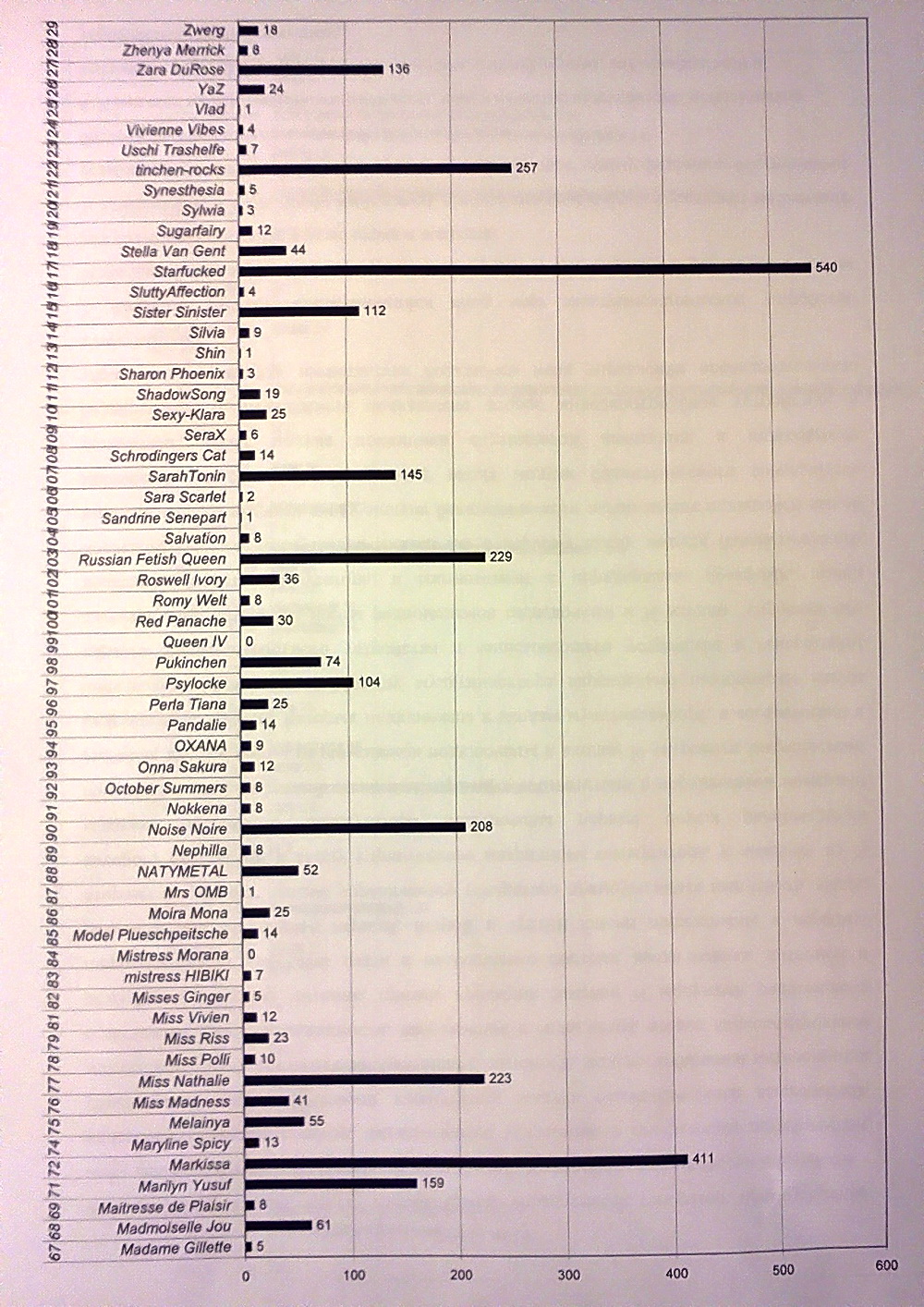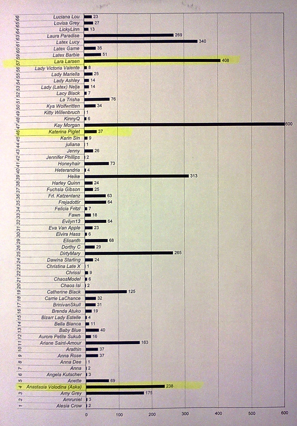 Ну а что с нашими девчонками? У Аски невысокие показатели, но твердый и уверенный рост. Хотя ей далеко до "ракеты" ЛарыЛарсен. У Пиглеты показатели более чем скромные. Ну а за Эльвиру практически никто не голосует, даже гяуры. Ну неверные, они и есть неверные.