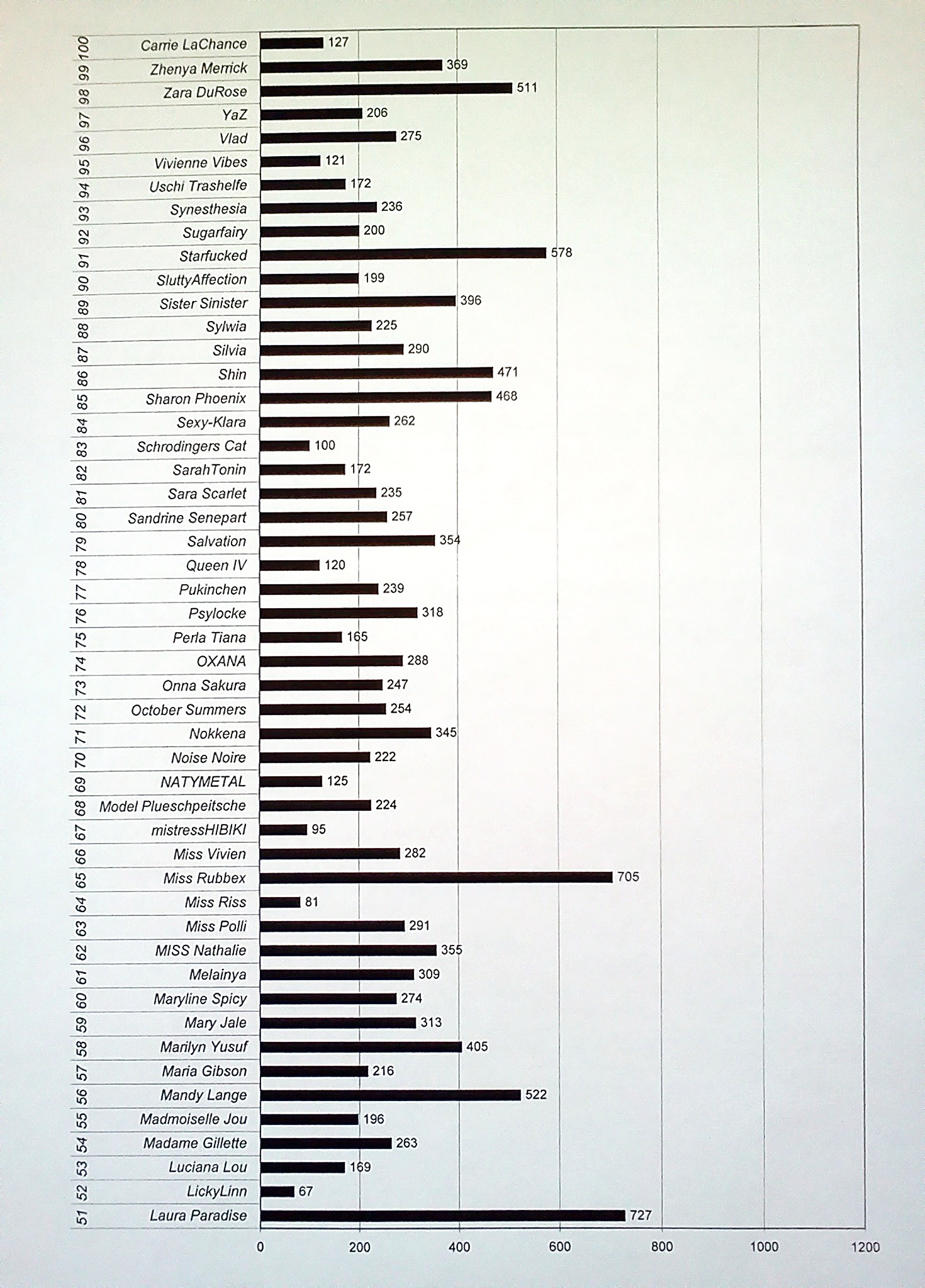 Мы по-прежнему в лидерах! Безусловный лидер - Аска, а Катерина постепенно догоняет Латекс Льюси. Очень уверенно идут Лара Ларсен, Мисс Рубекс и Лора Парадайз. Все остальные участники образуют некое "стадо" в котором разница в очках сравнима со статистической погрешностью.