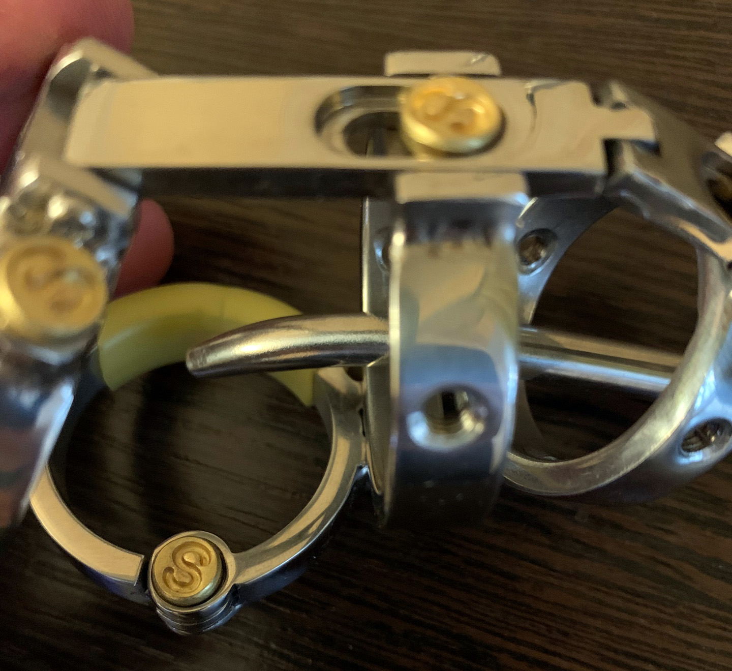 Все соединения скреплены S винтами. Невозможно снять без специального ключа. Съемный катетер.