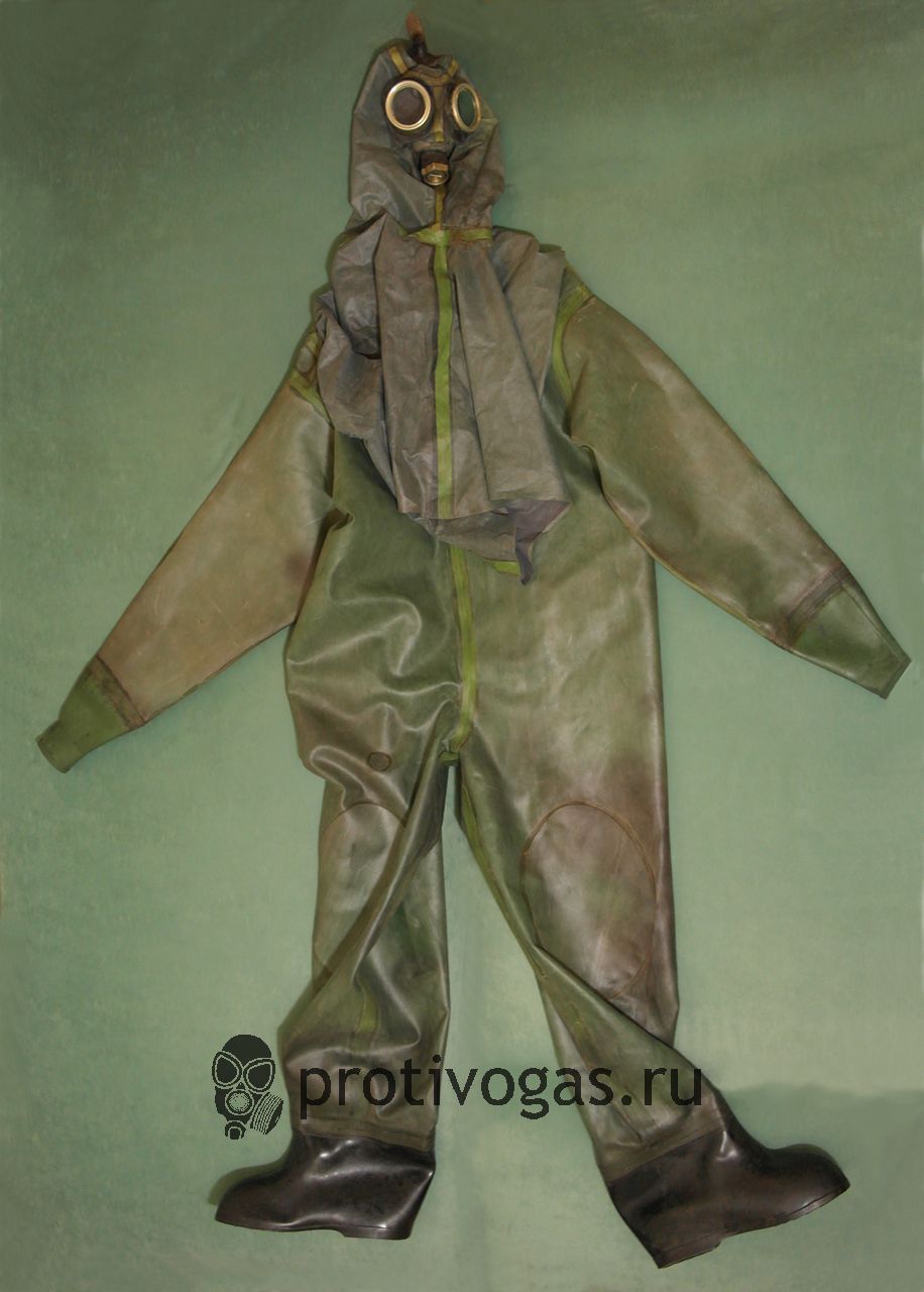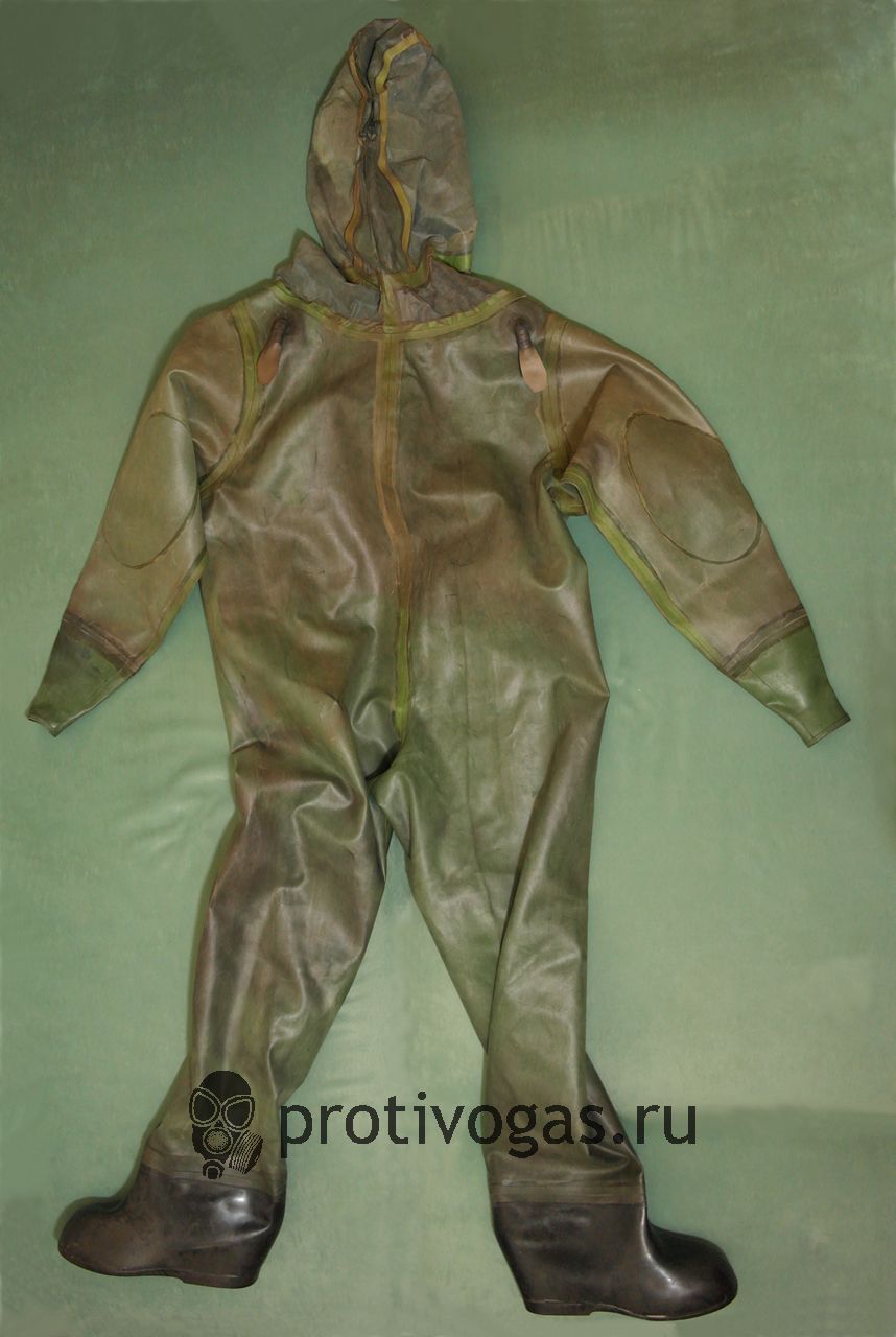 Изготовлен из очень плотной зеленой прорезиненной ткани, на ногах - бахилы, на груди - лаз под жгутовку. Шлем с круглыми очками с клапанами стравливания давления, на рукавах тугие манжеты для гидроизоляции