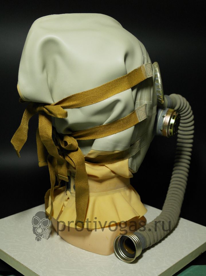 Представляет собой резиновый шар с тряпичными завязками на затылке. На шее латексная пелерина с застежкой - крючком, плотно облегает шею. На щеке справа - кпалан выдоха, клапан вдоха находится непосредственно на выходе трубки - гофры в самой маске