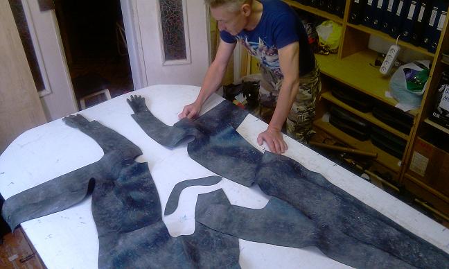 Чо-то эти два гоблина народ тут заинтриговали, Эльвиру запугали. Теперь уже реально и не знаю, что из этого всего получится и получится ли вообще хоть что-то. А шьется всё нитками, впрочем, клеится тоже, потому что пытаемся шить мокрые гидрокостюмы из неопрена с фактурным покрытием.