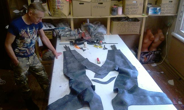 Чо-то эти два гоблина народ тут заинтриговали, Эльвиру запугали. Теперь уже реально и не знаю, что из этого всего получится и получится ли вообще хоть что-то. А шьется всё нитками, впрочем, клеится тоже, потому что пытаемся шить мокрые гидрокостюмы из неопрена с фактурным покрытием.