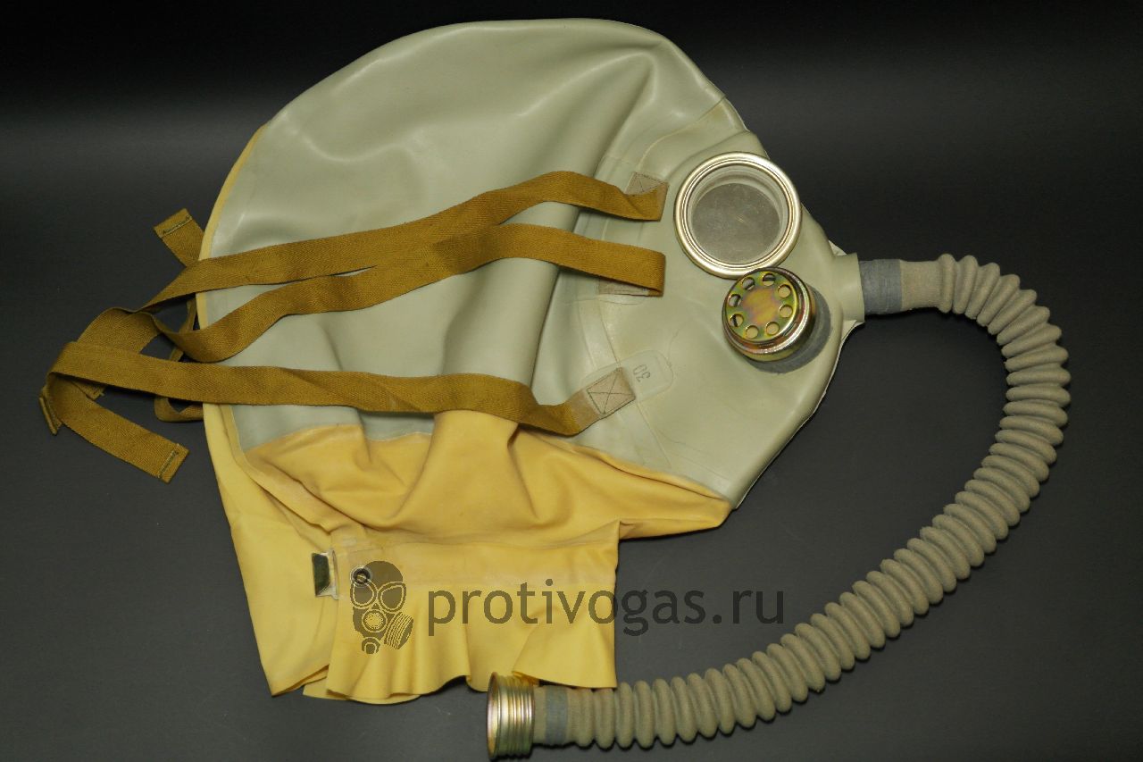 Представляет собой резиновый шар с тряпичными завязками на затылке. На шее латексная пелерина с застежкой - крючком, плотно облегает шею. На щеке справа - кпалан выдоха, клапан вдоха находится непосредственно на выходе трубки - гофры в самой маске